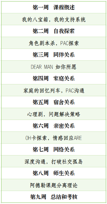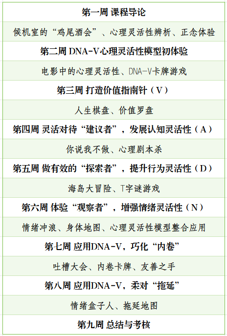 本课程是以接纳承诺疗法(ACT)为理论基础、聚焦DNA-V心理灵活性模型而设计的体验式心理健康课程。通过科学系统的理论讲解、极具趣味性的体验活动和每周正念练习,帮助同学们在变化环境中安住当下,联结内在价值,培养心理灵活性,全方位提升应对现实压力和情绪困扰的适应力。加入我们,开启属于你的心理灵活性之旅!