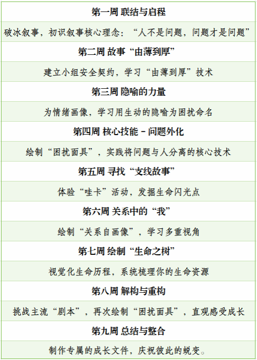 我们以叙事疗法为核心,秉持 “人≠问题”的尊重视角,通过小组讨论、叙事体验、艺术表达等形式,引导你从问题故事中解脱,发掘被忽视的生命“支线故事”(那些闪光的优势、成就与独特资源),从而提升心理弹性、自我效能感与社会支持感,活出更轻盈、更自主的生命篇章!