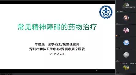 12月1日晚19:00,心理健康教育与咨询中心(下称“心理中心”)举行本学期第2场面向专兼职咨询师的内部专业培训,培训主题为“常见精神障碍的药物治疗”。此次培训由深圳市康宁医院精神科副主任医师、公共卫生部部长毕建强副主任医师主讲,中心副主任韦君如老师主持,共有57名专兼职心理咨询师参加了培训。