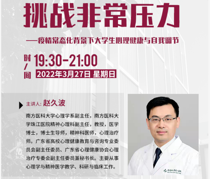 疫情常态化背景下,同学们可能会出现焦虑、抑郁、烦躁等情绪,为了帮助大家更好的进行自我调节,积极有效应对,维护好自身的心理健康水平,心理健康教育与咨询中心于2022年3月27日19:30在腾讯会议举行了主题为“挑战非常压力:疫情常态化背景下大学生心理健康与自我调节”的讲座。本次讲座由南方医科大学心理系副主任赵久波教授主讲,心理中心副主任刘玎老师主持,共600多名师生参加。