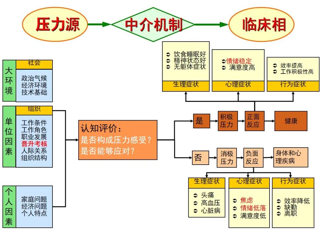 郭老师强调压力通过中介机制影响个体,主要包括认知系统、社会支持和生物调节三个方面。在认知系统中,个人抱负水平、人格特征、既往经历等因素会影响个体对压力的认知评估,对行为、认知和环境的控制感影响个体对自己应对压力的能力评估。