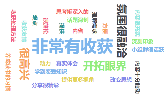 本次活动由专职心理咨询师蔡洁钒老师和心理学院研究生林明萍带领。为期12天的阅读中,蔡老师提供专业指导,与带领学生在小组内营造温暖与活跃的互动氛围, 阅读同学们每日打卡内容,及时给予回应和疑难解答。同学们在自主阅读、打卡分享、讨论困惑与体验思想碰撞中逐渐敞开心扉,对亲密关系这门终身学习与实践的学问有了更深的见解。本次活动经过报名筛选,共有78名同学参与,总体平均满意度为9.26分(满分10分)。
