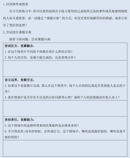 📖这次课题分离练习除了让我更好地理解这个概念,同时也体会到“课题分离”确实能让自己在人际交往中的负担减少。也意识到自己会有干涉他人课题的行为,甚至是将自己的想法强加在他人身上。这样就会使自己就过于强势,事后也会对自己的行为感到不满。经过这次的练习,为我处理人际关系提供了新的思路。