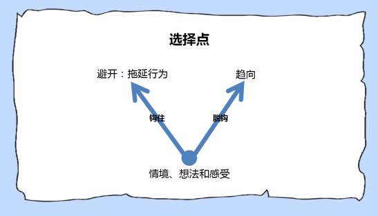接着,参与同学们分享自己曾经尝试过的应对拖延的方法及其效果;在这个过程中,大家纷纷表示其实他们深知自己为什么会拖延,也尝试过很多方式应对拖延,但是效果不尽如人意。为此,带领者分享了ACT中“选择点”的工具,带领大家澄清在问题情境中的趋向和避开行为。
