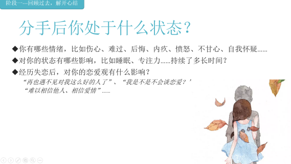 活动建立在安全友好的关系基础上开展,团体成员共同约定了保密、真诚、接纳与不评判的团体规则。在正式活动中,带领者与团体成员围绕“回顾过去”---处理分离与丧失感、“体认现实”---分析关系中的问题,提取经验与反思以及“展望未来”---明确你的依恋类型、在关系中的需求和期待三个阶段展开分享与讨论。