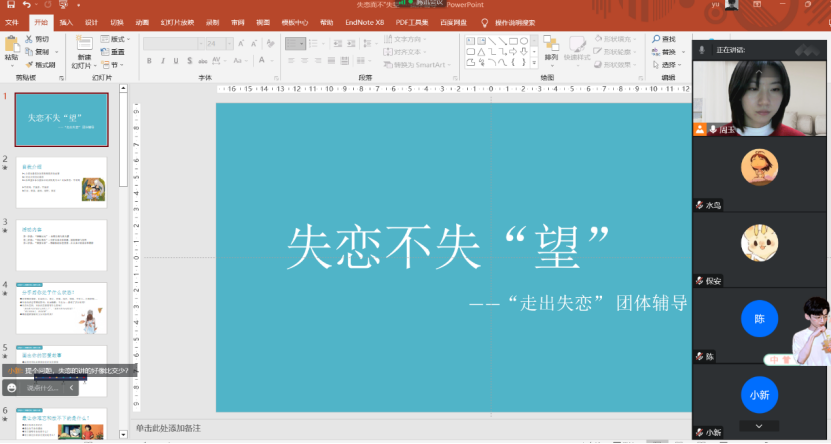 2022年12月16日,由深圳大学心理健康教育与咨询中心主办的“失恋不失望”心理工作坊顺利举行。本次活动由心理中心专职老师专业指导,心理学院研究生周玉和姜薇薇带领,本次活动因疫情原因使用腾讯会议线上进行,共12名同学参与。