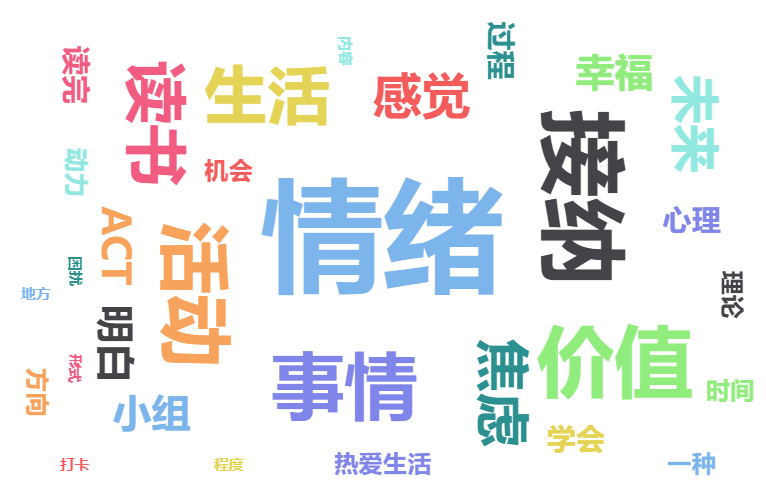 为期21天的阅读与练习,75名参与同学通过自主阅读、打卡分享、讨论困惑与练习体验,逐渐对如何面对困扰自己的想法,如何非对抗地接纳担忧、恐惧、焦虑等情绪,又如何遵循自己的价值观生活等议题有了更深的见解。
