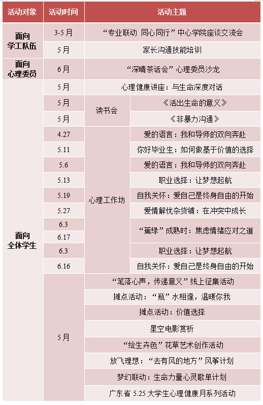 心理健康教育与咨询中心策划并发布通知,各学院心理辅导站根据学生特点与需求自行开展特色活动,动员和组织好本学院学生积极参与,宣传月结束后(6月9日前)将学院活动总结(附件1)发送至maierhaba@szu.edu.cn
