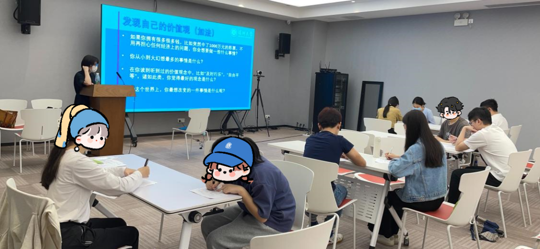 在小组讨论中,参与同学采用“加减法”的方式澄清自己的职业价值观并将其排序。例如,有的同学在工作中看重成就感,有的同学看重经济回报或安全感。参与同学在互动中发现,虽然价值观不尽相同,但当我们选择从事趋向自己价值观的职业时,会更容易地投入热情和耐心。