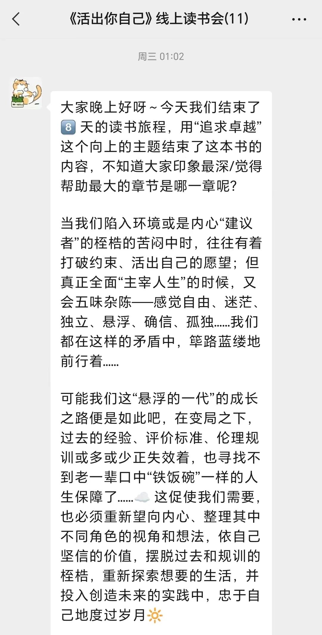 在为期8天的读书会中,参与同学在带领者每日发布的打卡计划中完成阅读,写下自己的体会、感受,在线上读书小组中进行分享。在打卡的过程中,参与同学也分享了自己关于情绪、人际等方面的困惑,引发了大家的相互回应和讨论。