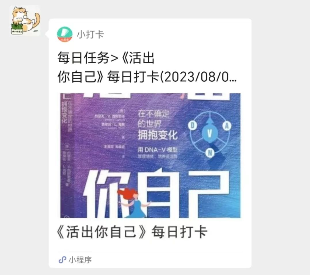参与本次读书会。这本书从“僵尸世界”和”活力王国”两个地方引入,用DNA-V模型分享了视角和价值的重要性。大家共同通过积极阅读、打卡分享、自主交流讨论,逐渐了解并掌握DNA-V视角转换方法,学习如何让自己分别从观察者(N) 、建议者 (A) 、探索家 (D) 认识自我;也了解了在不同情境下的自我调适,识别建议者发出建议的目的,并尝试使用书写、绘画、和想象等方式锻炼自己的视角转换能力。