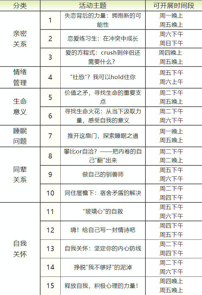 荔园心晴”工作坊拟开展时间为11-12月,聚焦学生自我探索和人际联结重要发展任务 (具体主题如下表),每场活动1.5小时,参与人员限30人。