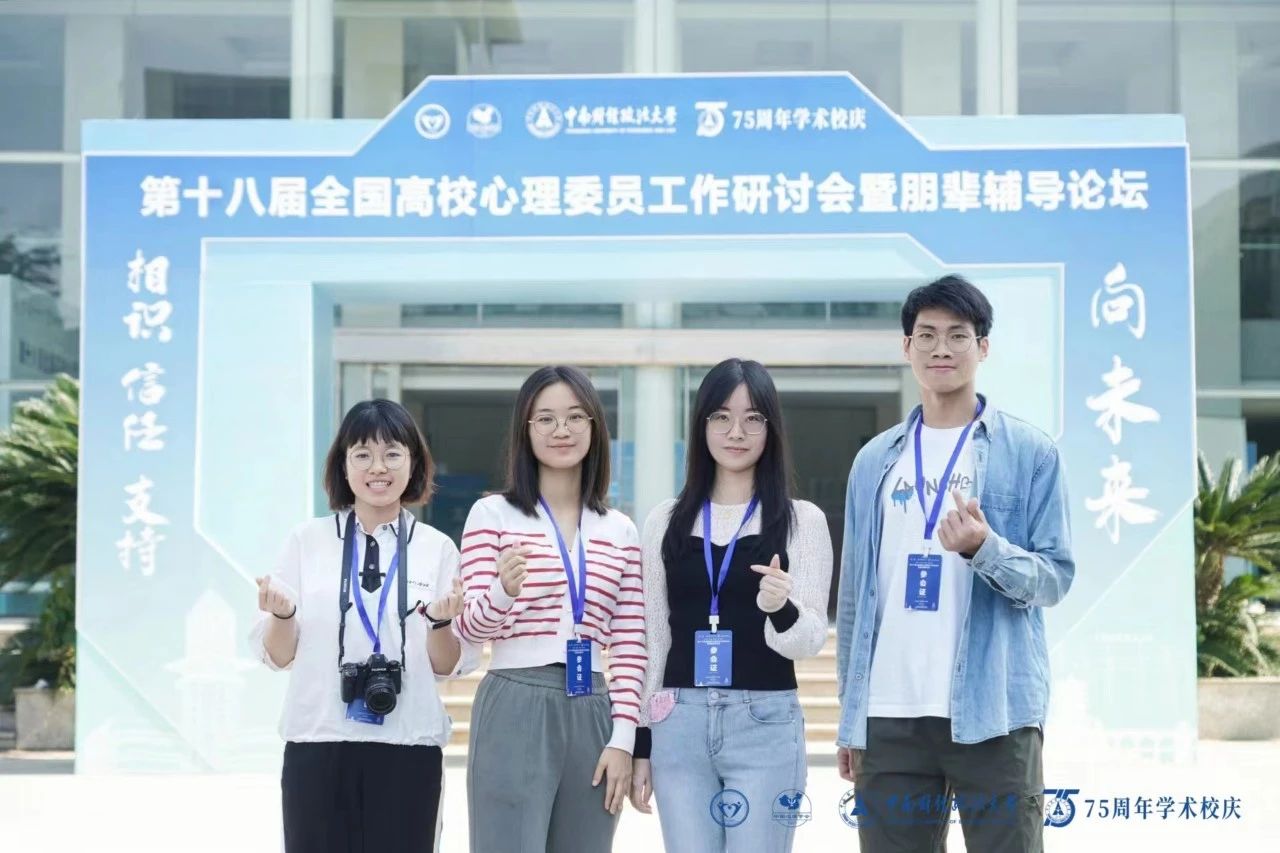 中国心理学会危机千预工作委员会于2023年11月1日至3日在中南财经政法大学召开第十八届全国高校心理委员工作研讨会暨朋辈辅导论坛。我校心理中心蔡洁钒老师带领心理委员陈嘉伟、刘玺鼠、陈玮烨出席。