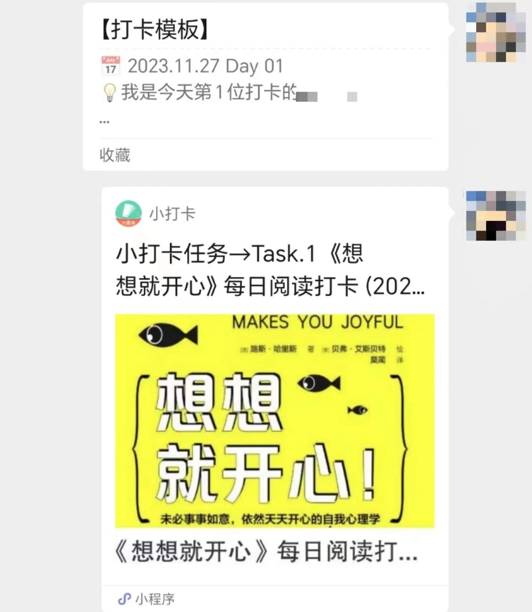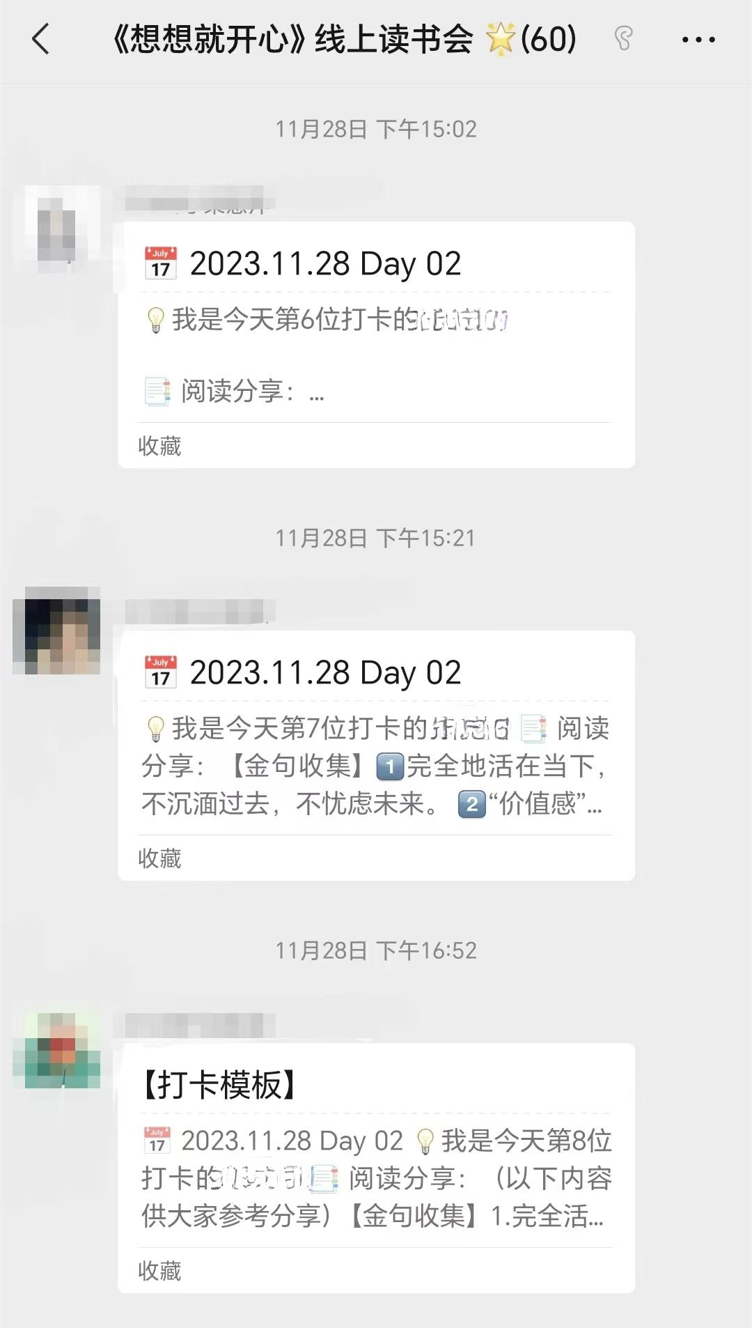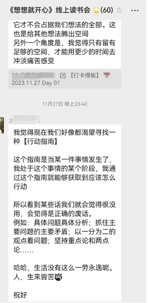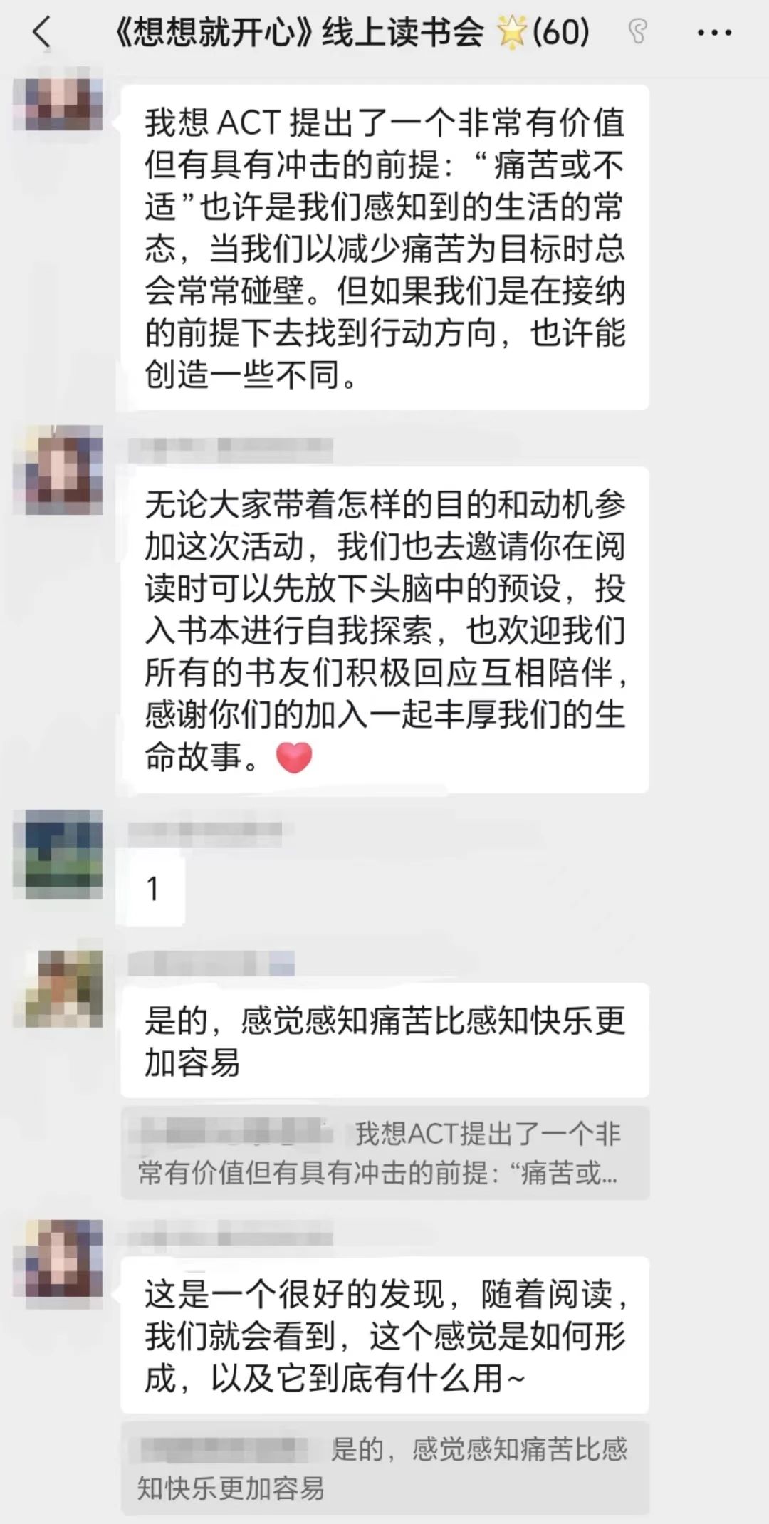 大家通过自主进行阅读、分享每日阅读感受和群里互相交流,不仅让自己更加了解了接纳承诺疗法,破除了关于“幸福、开心"的迷思,还练习了书中提及的认知解离、澄清价值、正念等技巧,实践更具接纳而有意义的生活!