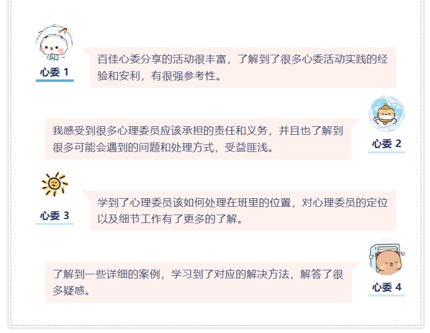 随后,由参加第十八届全国高校心理委员工作研讨会暨朋辈辅导论坛、我校全国百佳心理委员和百佳心理委员提名奖的三位心理委员分享工作经验及参会体会。