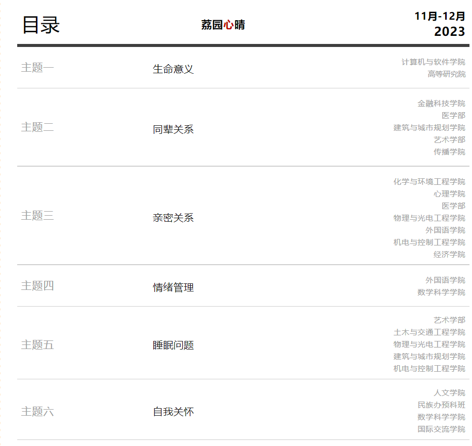 2023年11-12月,心理中心结合我校学生的实际情况,围绕常见的心理困扰和心理成长需要,创新性地启动“荔园心晴”工作坊,将心理健康服务送入学院本次“荔园心晴"工作坊,由中心专职老师指导,实习咨询师带领,在18个学院 (部) 开展24场,活动主题涵盖亲密关系、情绪管理、生命意义、睡眠问题、同辈关系、自我关怀等心理健康六大领域,总参与学生超过700人,平均满意度为8.9分。呈现五大特点