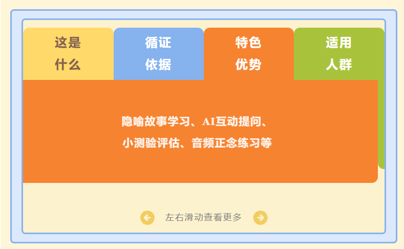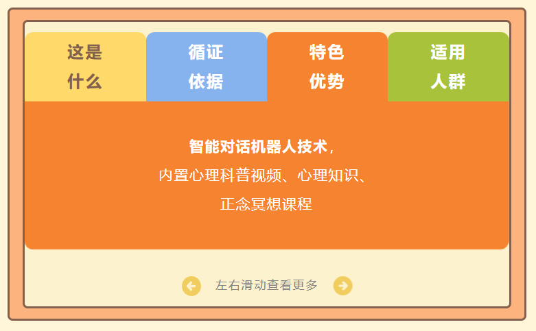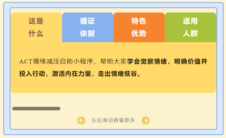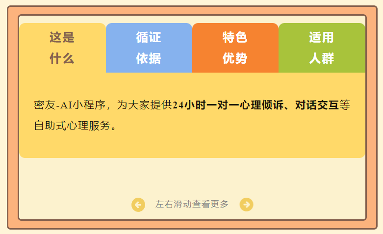 我们引入了一系列具有AI元素的心理健康自助小程序,协助大家在日常生活中更及时、便捷、有效地获取循证心理健康资源,以此加强对自我心理健康状态的觉察,有效缓解情绪和压力,发挥自我资源和潜能。