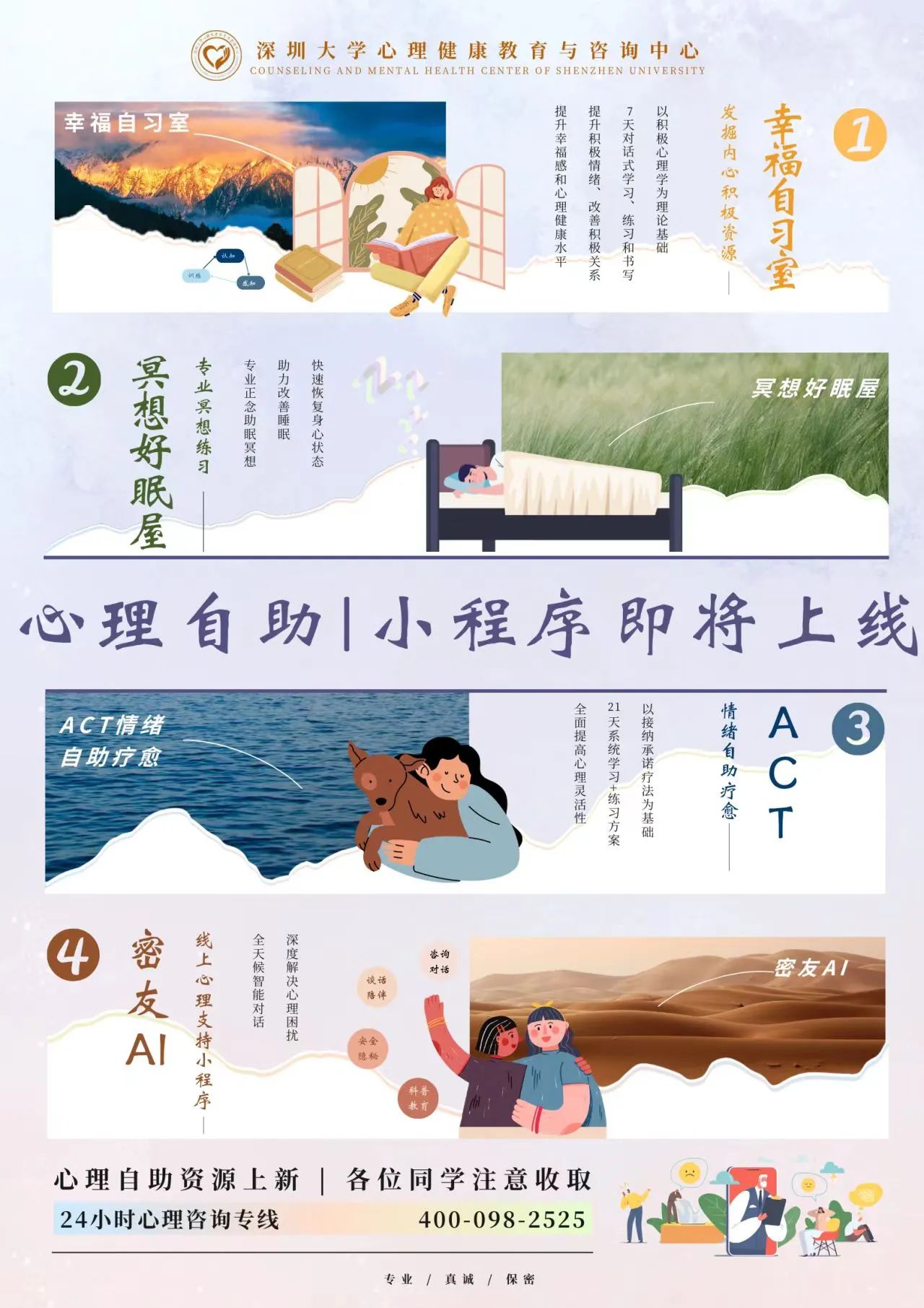 亲爱的同学们,大学虽充满挑战但也蕴藏机遇,每一次挑战都是学习和自我提升的机会,希望这些心理自助小程序,能成为大家成长路上的良伴。