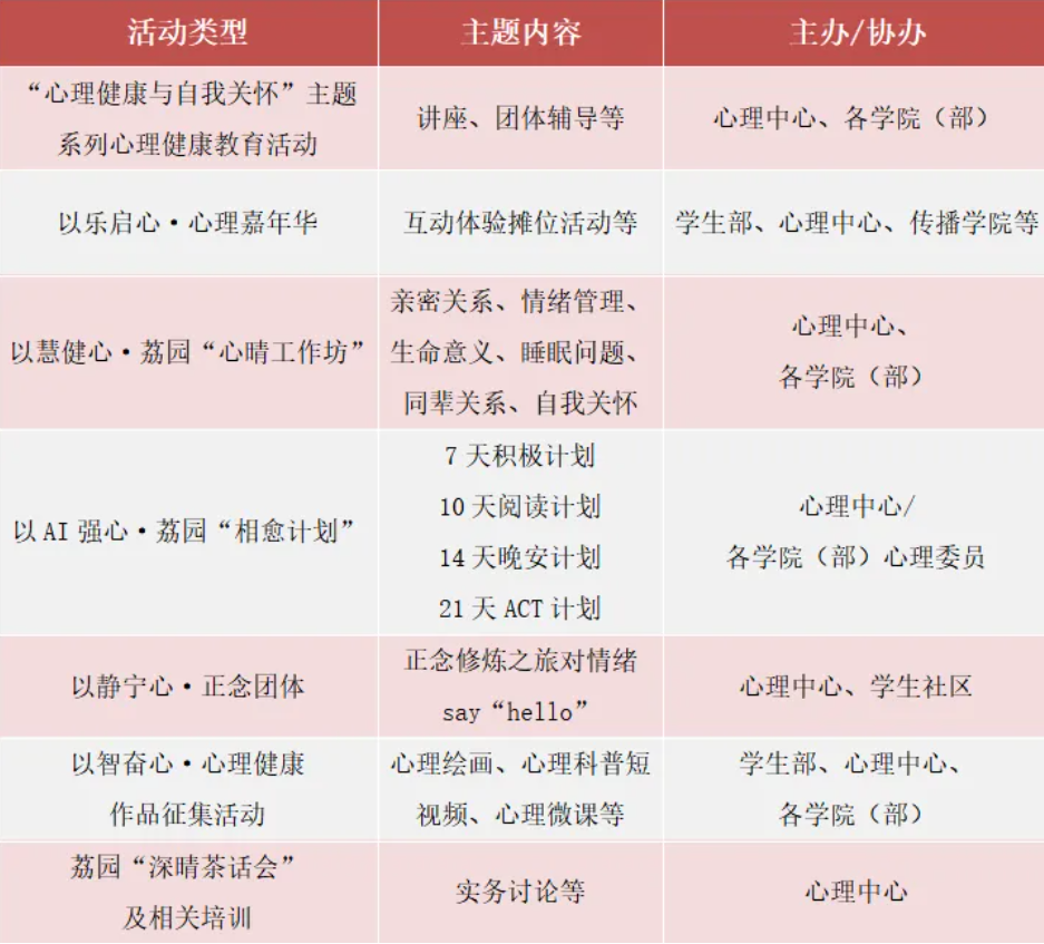 (1)以乐启心·心理健康嘉年华:在粤海校区公共空间,通过一系列摊位互动游戏和心理健康设备,促进学生在轻松温暖的氛围中了解心理健康知识,营造良好的荔园心理健康氛围。