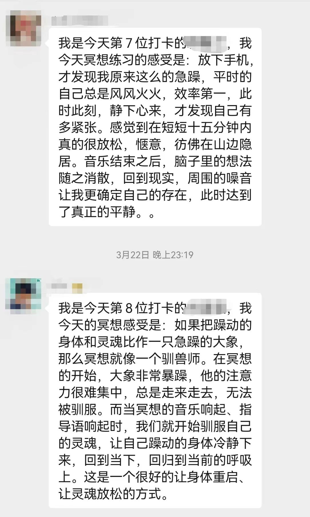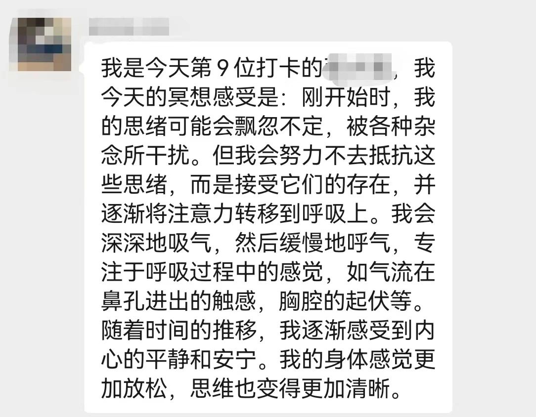 大家通过积极体验、主动打卡分享和沟通交流,不仅在冥想练习中更加关注自我,还能够借助冥想练习缓解焦虑,改善睡眠质量。