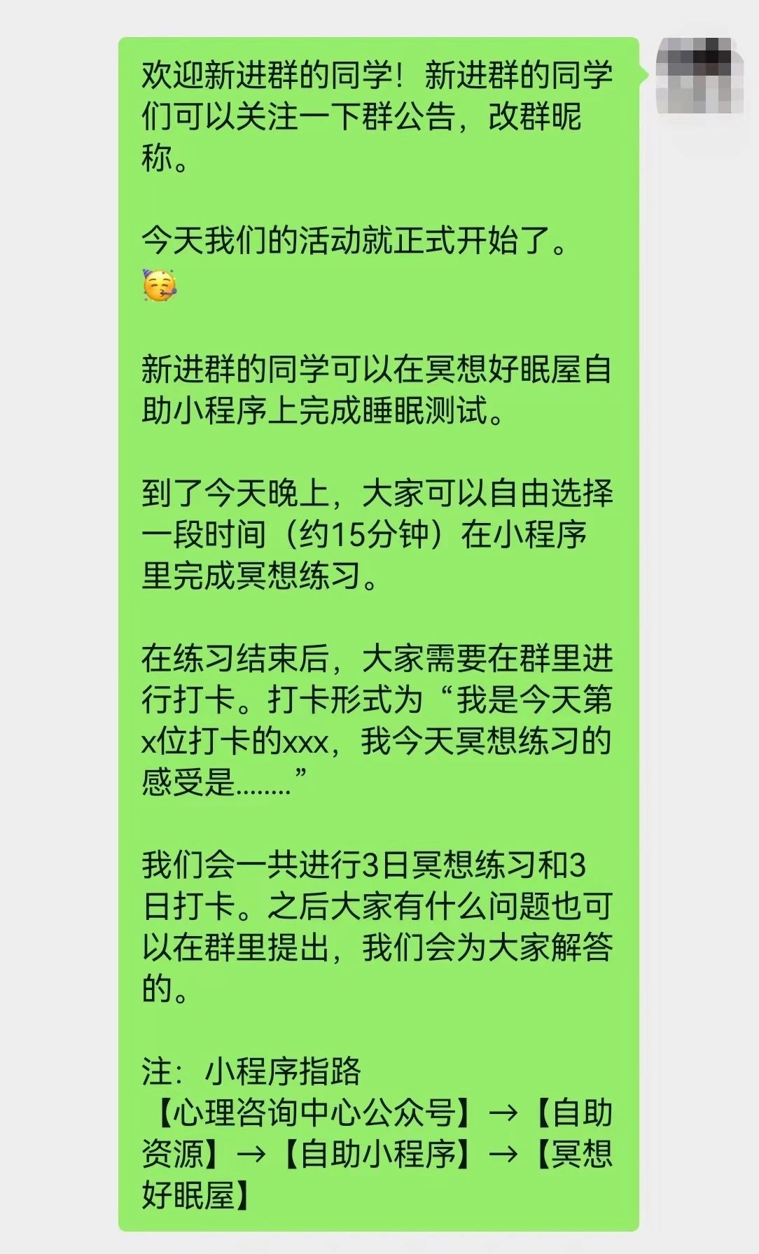 活动结束后,不少同学在反馈中表示在冥想音频指导以及冥想实践练习过程两方面受益最多,并表示自己在结束冥想练习后,感受到身心放松,睡眠状况有初步改善。同时也非常愿意向身边的朋友推荐冥想练习。结束活动后,我们收集了大家的反馈,感谢大家的用心投入与坚持!也希望有更多的同学能够加入心理自助的行列,调适自我,关爱自我!