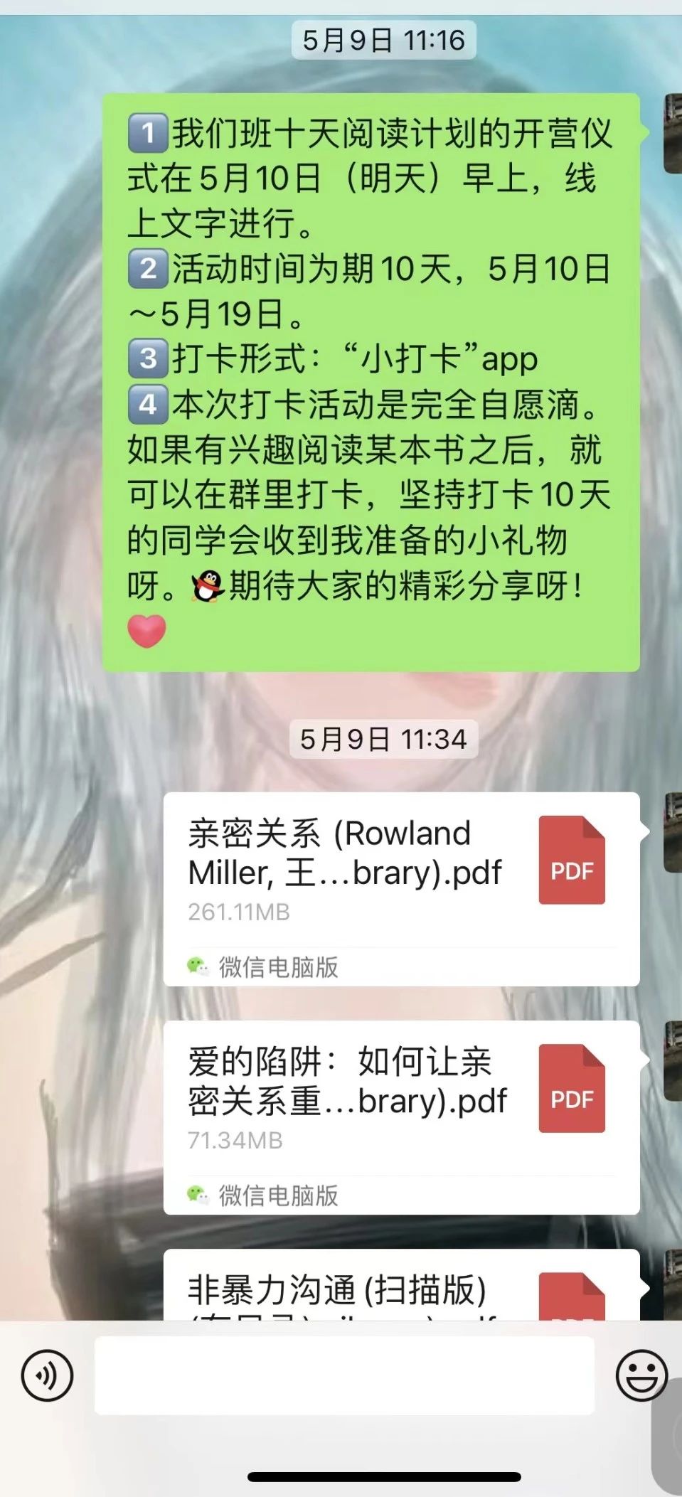 在“10天阅读计划”活动中,心理委员带领同学们阅读心理自助书籍,和同学们一起了解心理健康知识,发现自我,共同成长。
