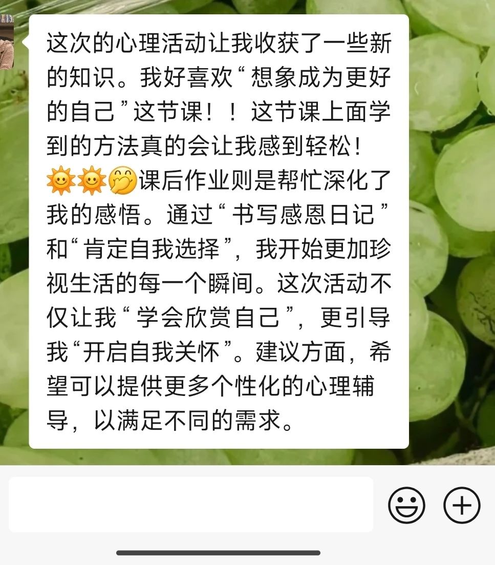 在本次活动中,我学习了丰富的心理知识,学会了自我关怀、发现与欣赏自我,能够向更好的自己不断靠近。
