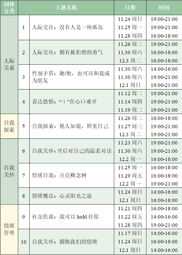 “荔园心晴”工作坊拟开展时间为2024年11月,聚焦学生自我探索和人际联结等重要发展任务(如下表,菜单式主题和时间供选择)。每场活动1.5小时,每轮参与人员限20人。