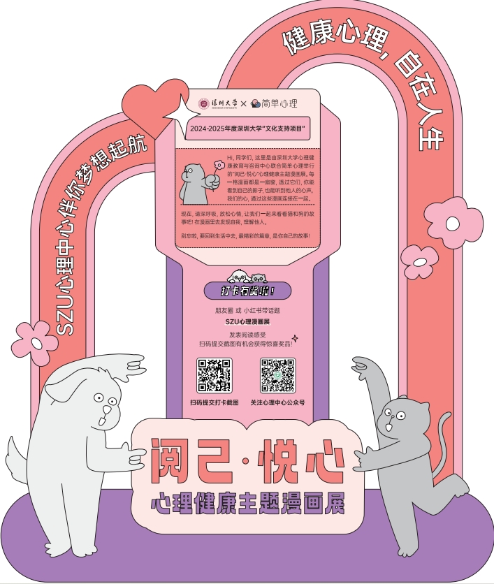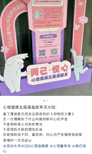 2024年11月18日至12月16日期间,由心理中心联合简单心理、文山湖社区开展的“阅己·悦心”心理健康主题漫画展在丽湖校区体育馆、粤海校区森林校巴花园顺利举行。本次展览以心理健康为主题,通过一系列富有创意和深度的漫画作品,展示了敏感、内耗、人际沟通、恋爱以及自我成长等同学们普遍关注的心理话题,以生动形象且通俗易懂的方式向同学们传递了心理健康知识和积极的生活理念。参与活动的同学对活动的整体满意度、内容满意度以及形式满意度的评价平均分均达9分(满分10分)。