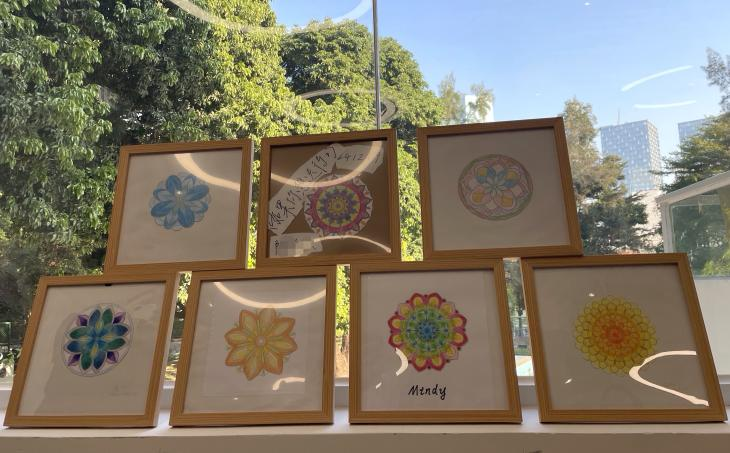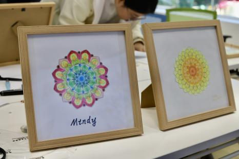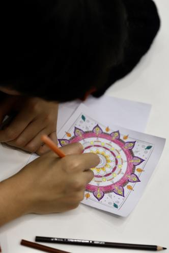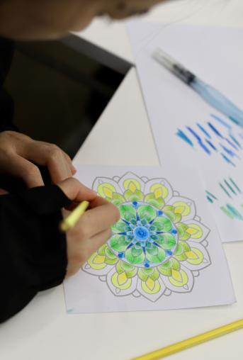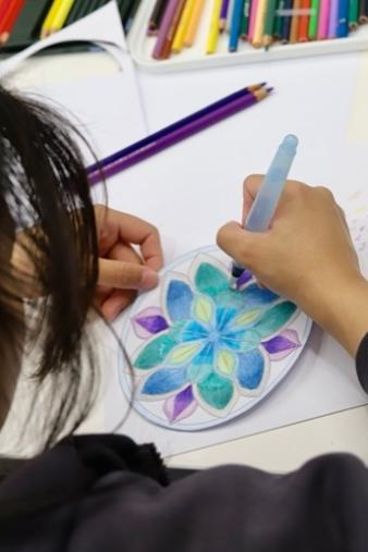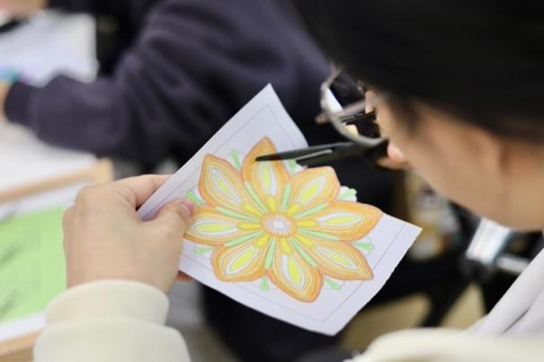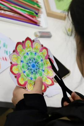 在舒缓的音乐中沉静下来,同学们选择自己喜欢的图案,在正念中感受此时此刻。接着,跟随感受挑选喜欢的彩笔,通过舞动彩笔,让心灵自由飞扬,绘出绚烂之花。