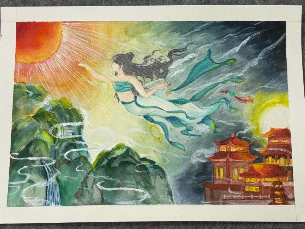 借鉴敦煌壁画中飞天的形象和动作表现出内心丰富的情感流转,人物脱去簪钗,褪去金玉珠饰,背去层层宫墙禁锢的繁华宫殿,向往散发光芒的太阳而飞,意为抛开世俗欲望。作者希望更多大家能够不受世俗欲望所困,懂得借自然的疗愈之力放松自己,内心平静,追求内心更深层的快乐。