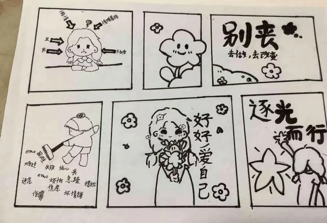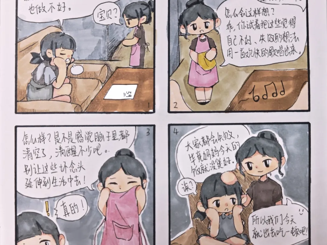 漫画讲述了一个小孩因考试失利而自我否定,母亲通过引导他用音乐表达情绪,帮助他认识到失败是成长的一部分。最后,母亲提议外出用餐,既是告诉孩子失败是寻常事,也是以此作为放松。通过这个故事,传达了积极面对失败,寻找新动力的重要性。