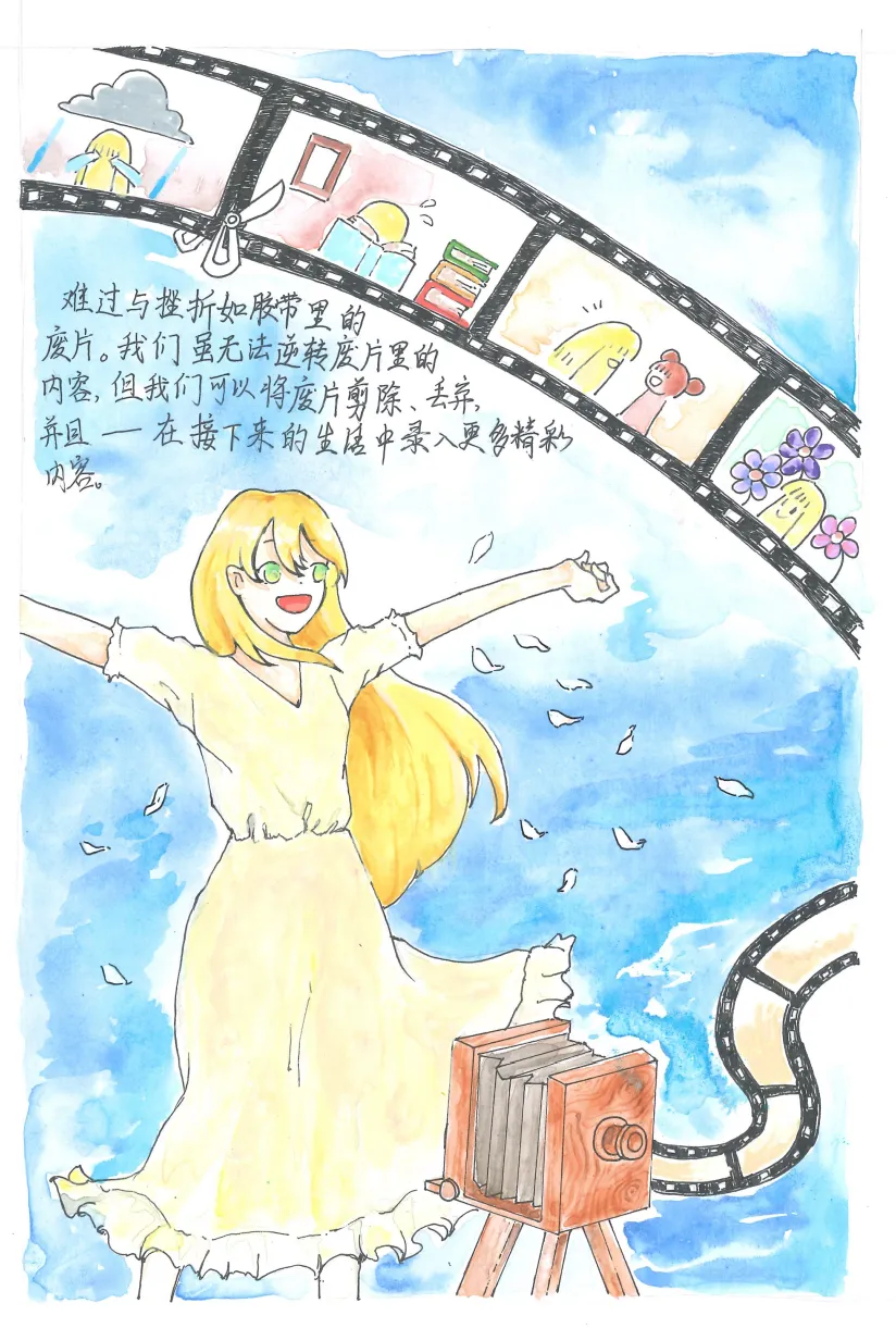 作品通过描绘人物和相机相片,关联了人生与相片之间的巧妙相似性,人生的各个阶段定格于人生的相机中。作者阐述我们在人生旅途中或多或少都会遇到难过和低谷,它们如相机里的废片我们无法对其进行更改,但我们可以像剪掉废片那般将其抛之脑后,并且在接下来的日子中演绎出更多的精彩人生。