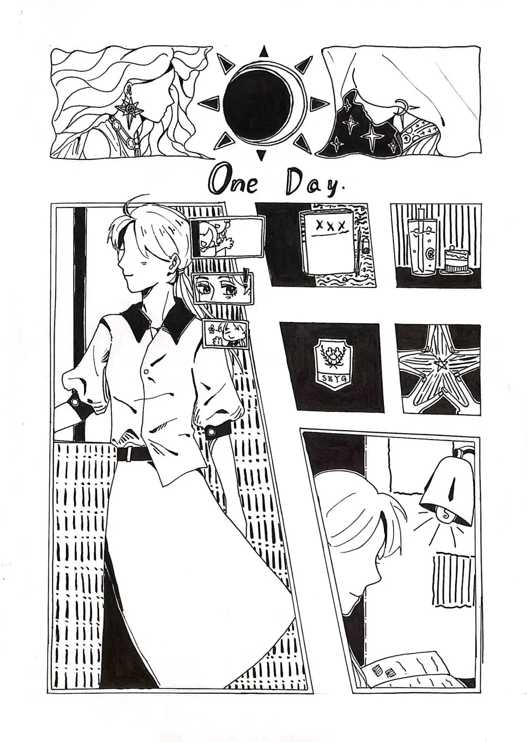 画面以“日月女神”象征时间与心态的平衡,右侧分镜依次呈现——学习;美食;义工;与舍友互动;夜读。描绘一名大学生积极平衡学习、社交、公益与自我关怀的一天,展现健康心理状态的养成方式,倡导关注情绪管理与生活节奏。色调从清晨的活力到夜晚的宁静,暗喻张弛有度的心理调适。作品以视觉叙事提醒观者:心理健康并非抽象概念,而是藏于日常的自我觉察、人际联结与平衡之道,传递“呵护心灵如日月交替,需光暗相融”的隐喻,鼓励大学生在忙碌中学会自我滋养。