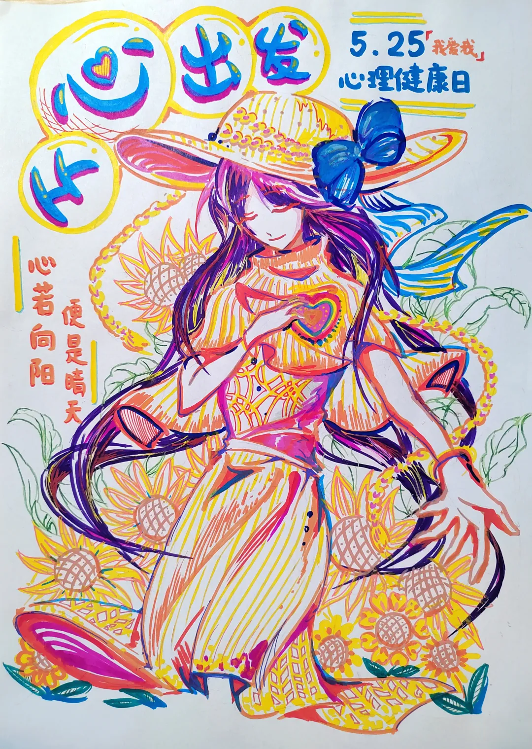 作品通过中心人物与向日葵的动态呼应,传递“从心出发”的自我疗愈主题。画中女子舒展手臂,面容宁静,象征个体主动拥抱内在力量;环绕的向日葵以突出的明黄色调绽放,既是生命力勃发的隐喻,亦暗示社会支持对心理健康的滋养。画面大体用色采用橙红与金黄,强化温暖包容的氛围。本作品通过艺术化的积极意象,呼吁公众打破心理病耻感,在自我接纳中重拾生命光彩。