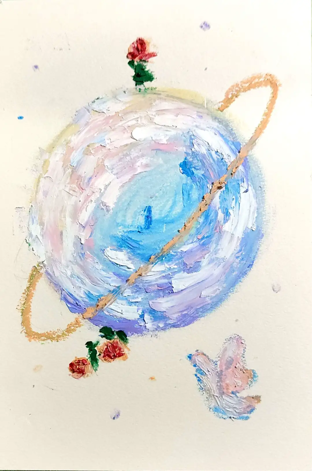 作品描绘了玫瑰根系刺穿冰封星球,吮吸猩红岩浆(力比多的永恒泵动),蝶翼用七层蓝紫油画棒拓印意识残影。作者将心理咨询室天花板上的沉默褶皱,翻译成一场星际量级的哀悼仪式:真空中的玫瑰不谈论救赎,蝶翅煽动宇宙弦,只为让所有悬而未决的眼泪获得天体级密度。星球是冻结的潜意识原浆,玫瑰以倒刺为锚钉住弗洛伊德式失眠。幽灵蝶悬停,翅尖抖落的粉色尘埃。