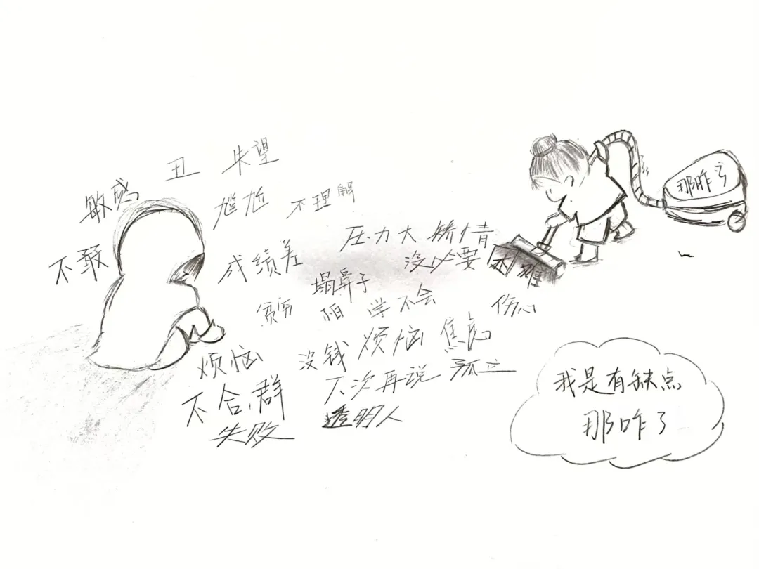 这幅插画展示了一个孩子因对自己的缺点感到沮丧,而另一个孩子则以积极的态度回应,强调接受自己的不完美。这种互动旨在传递一种积极的自我接纳观念,提醒人们不必因缺点而否定自己。