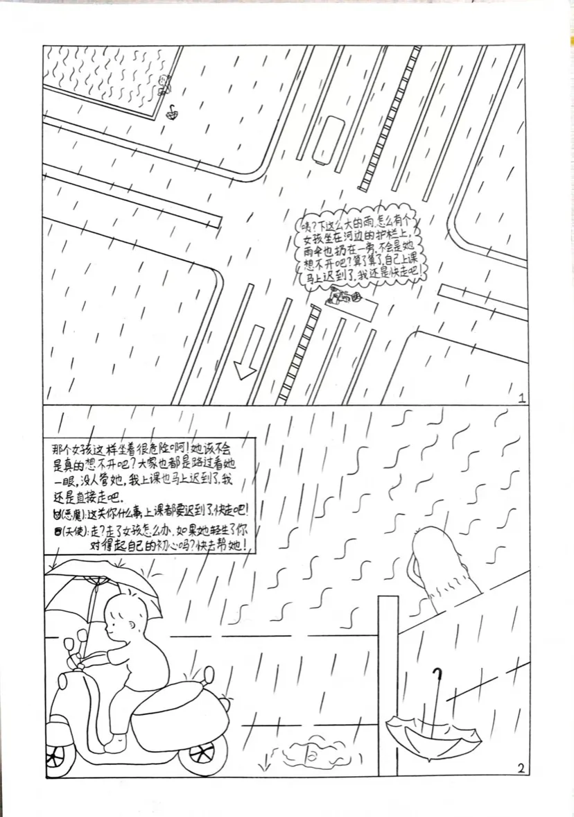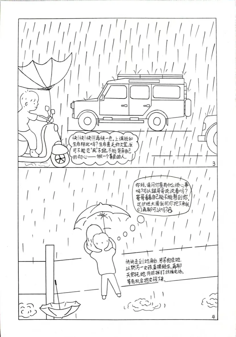 作品描绘了一个作者救下了一个想跳河轻生的女孩的真实发生的故事。作品将当时救人的过程、自己的心理活动和自己的内心感受通过绘画的方式表现出来。作者通过这次绘画告诉自己同时告诉读者一定要保持初心,守其不变,在自己力所能及的地方对他人施予援手。