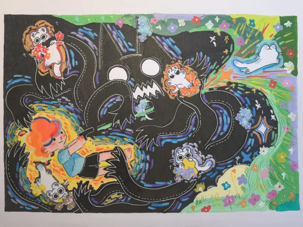 作品表现了小孩和猫猫携手用奔涌的色彩与盛开的鲜花对抗黑色怪物的场景。黑色的怪物是一切糟心事的集合体,小孩是积极抗争的自我,每一只猫猫是朋友的化身,奔涌的绿色开满鲜花,是生活中每一个快乐的瞬间。当我和朋友在一起时,就算糟糕的事情与负面情绪堆叠如潮水般将我吞没,我仍拥有五倍的快乐去回击,鲜花会在黑暗中蔓延。作者表达了希望每一个陷入困境的人都别忘记身边还有朋友相伴,那些生命里灿烂绽放的鲜花,终会汇聚成新的春天。