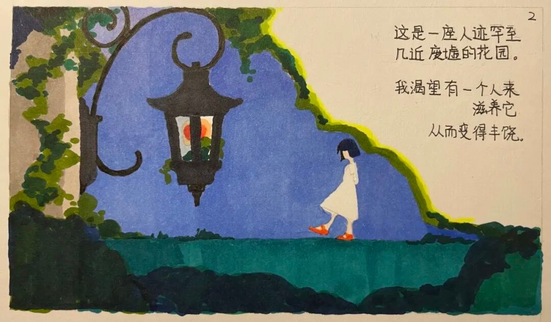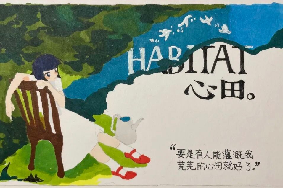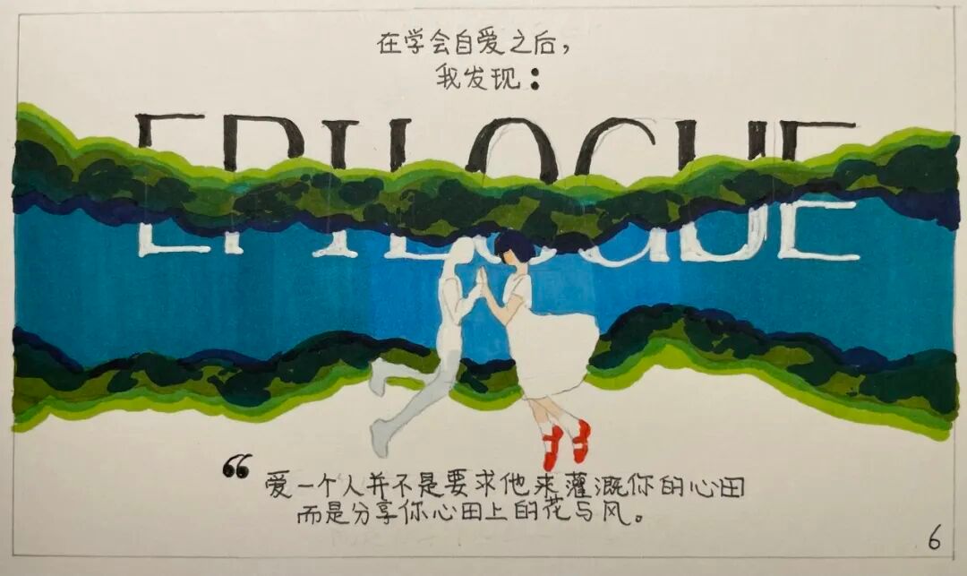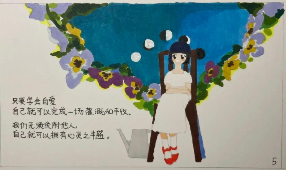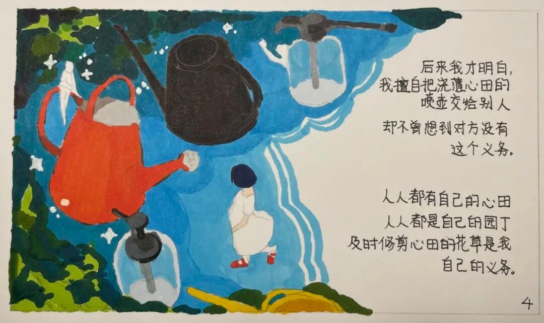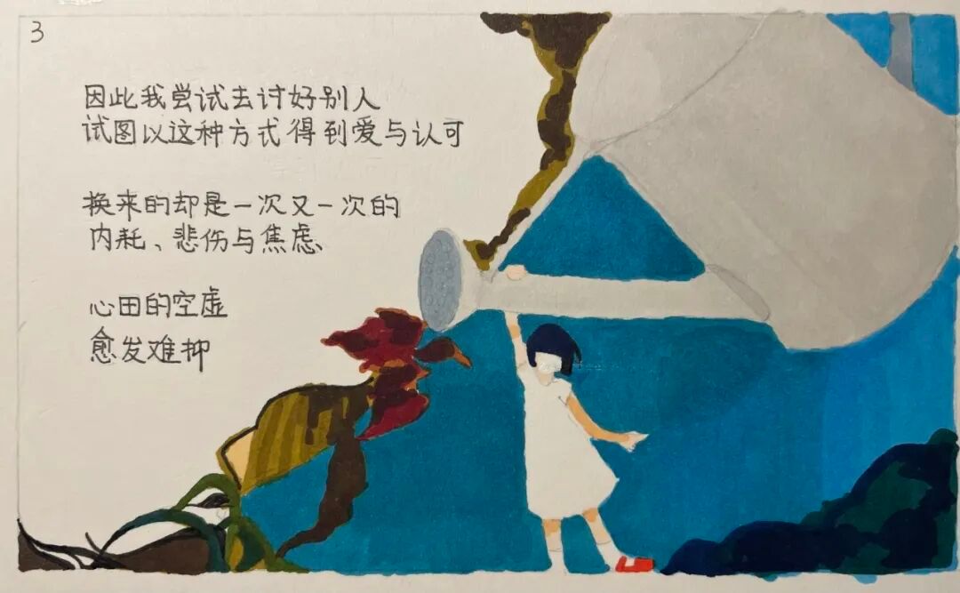 作品简介:通过漫画的形式来呈现“自爱”的隐喻,通过“心田”这一构念,明确了画面的主要元素为花草,蓝天,喷壶等并选择了以平面构成为主的画面以及简单的色彩,唤起大家对“自爱”与“爱人”的思考