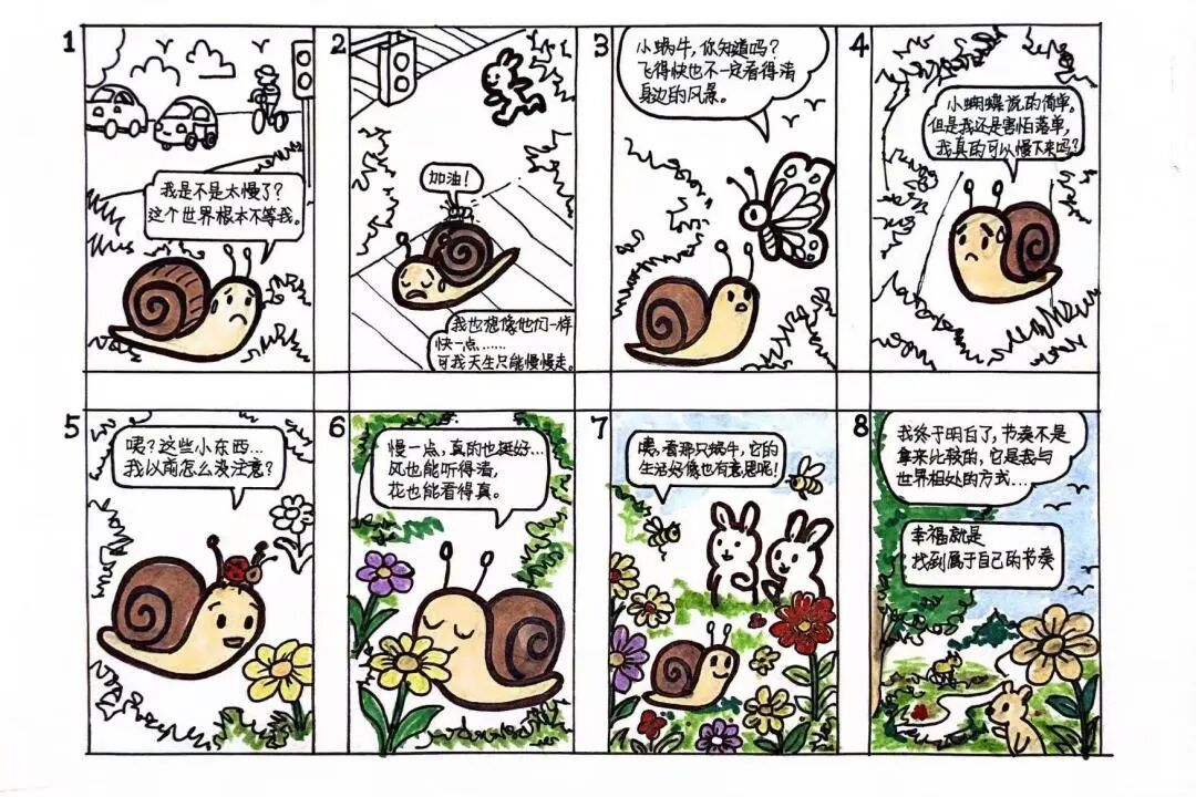 作品简介:作者描绘了焦虑的蜗牛在车流中迷失,被蝴蝶点醒后踏上探索之旅。它从身边的风景中逐渐领悟:慢不是缺陷,而是感知世界的独特维度。当它在花园中,动物们在各自的节奏中活动,快与慢的对立消融于时空中——生命的真谛,在于找到自己的时序刻度。