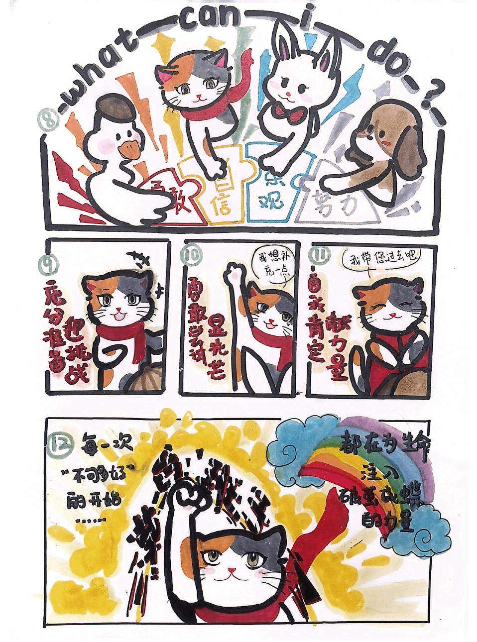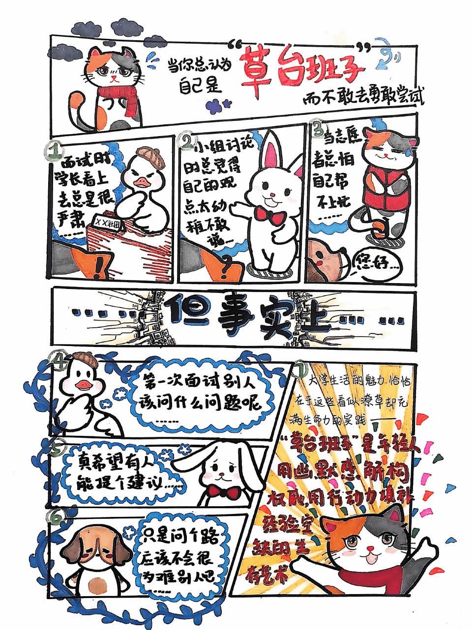 作品简介:本漫画以猫、鸭、兔、狗拟人化角色,生动展现其心理蜕变:从畏难逃避到被迫尝试,再到主动协作,最终完成任务并重拾自信。画面通过色彩与表情的渐变,凸显从焦虑到从容的成长历程,鼓励青年以实践为刃,破心理之茧,在沟通与担当中遇见更强大的自己。