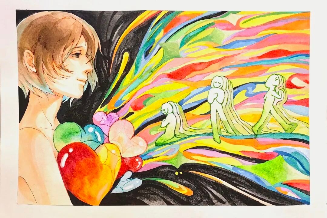 作品简介:这幅画通过人物、多彩爱心及抽象人形,以夸张色彩和表现手法,呈现内心世界的情感图景。在色彩交织与形象塑造中,传递出对生活、情感的思考,是内心情绪的视觉外化。