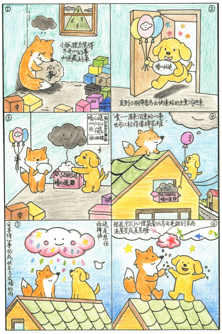 作品简介:本作品以"乌云快递站"为创意核心,通过小狐狸和小狗的互动,将情绪具象化为可传递、可转化的"乌云"。采用六格分镜结构,从压抑到释放,配合色彩渐变呈现情绪转化的全过程。 本作品聚焦青少年心理健康,希望以温暖的方式传递如何“合理应对情绪”。