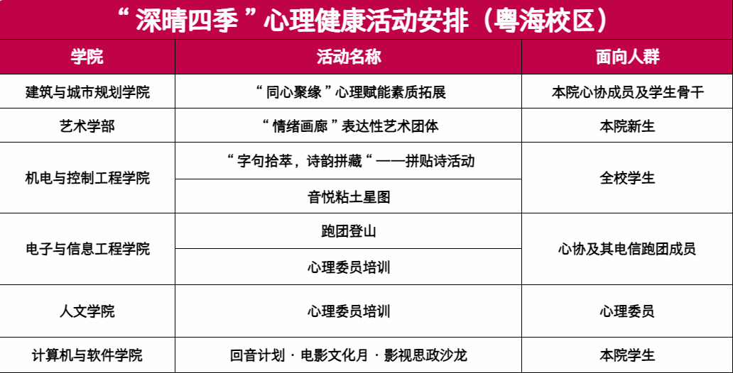 深晴四季之冬蕴11月,学海深耕,静待花开。当学期的旅程行至中段,在积累与沉淀交织的时光里,我们悄然开启“学业发展与生命教育”的温暖篇章。在心理健康教育与咨询中心的统筹下,各学院(部)精心筹备了形式丰富的系列活动,涵盖学业规划、时间管理、压力调适、生命探索等多种内容,旨在陪伴同学们在求知路上明晰方向、厚积薄发,并支持所有同学在岁末时节审视内心、涵养力量。愿这些冬日里的“心”活动,能成为同学们求学岁月中沉静而明亮的驿站,帮助我们更好地规划未来、安顿自我,以更从容笃定的姿态迎接成长的丰盈。