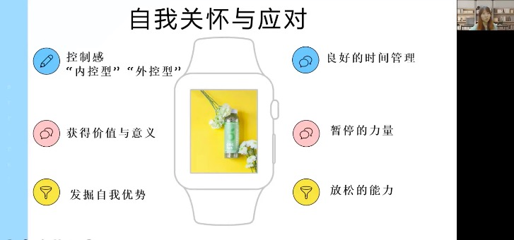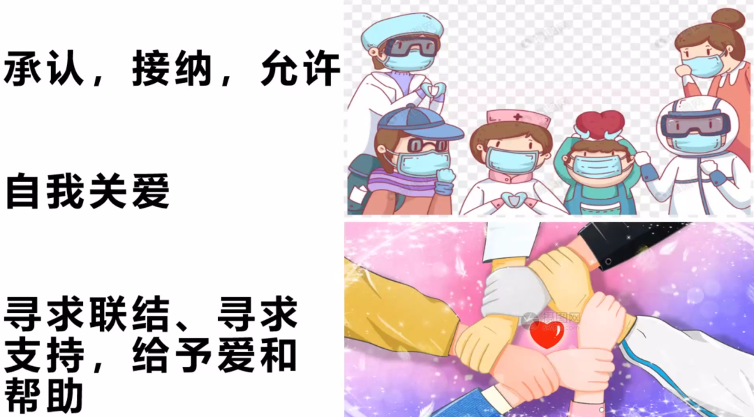 疫情下,大家居家无法返校,在校的同学不出校。吴老师着重与大家分享了疫情下进行自我和朋辈关怀两个策略:增强人际联结和加强自我关怀。