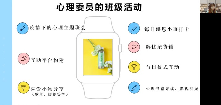 吴老师介绍道,增强人际联结就是要唤醒积极关系,适度的自我暴露、彼此构建帮助关系是重要途径,帮助他人是我们分享善意和积极情绪的方式,而表露真我、接受帮助则能让对方感受到自己的真实和真诚,同时也能因为自己“被需要”而感到成就感和价值感。此外,和朋友家人一起经历一些有仪式感的时刻、一起回忆生活中值得感恩的小事,也能增进人际联结、在积极心理暗示中获得身心愉悦感。对于心理委员这一角色,吴老师还与大家分享了可操作性强的线上互动关怀方式,如心理主题班会、每日感恩小事打卡、树洞分享等。