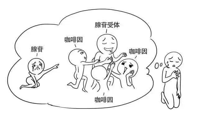 如果这时我们摄入一杯咖啡,咖啡中的咖啡因会竞争性抑制A1R和A2AR受体,阻断腺苷与这两种受体的结合,阻止大脑“感到能量被消耗”,进而让我们保持清醒,这就是为什么当代人选择早C的原因。