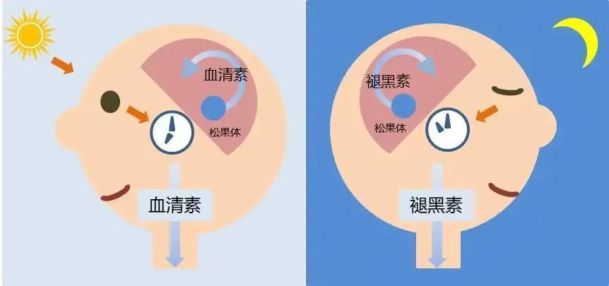 在SCN指示下,褪黑素(Melatonin,MT)在黄昏后不久就开始上升,从位于大脑后部的松果体中的神经内分泌腺中产生,通过血液循环到达靶细胞,和细胞膜上镶嵌的G蛋白偶联受体(GPCR)相结合,引发一系列下游通路的响应,以此“通知”身体细胞“该睡觉了”。