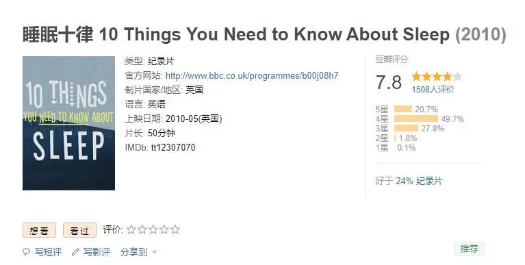 比较新的纪录片,动画做得很有美感,七集涵盖了不同的睡眠话题,每集末尾有一段睡前放松练习引导,介绍了冥想方法改善睡眠,以及“清醒梦”、“初夜效应”等概念。